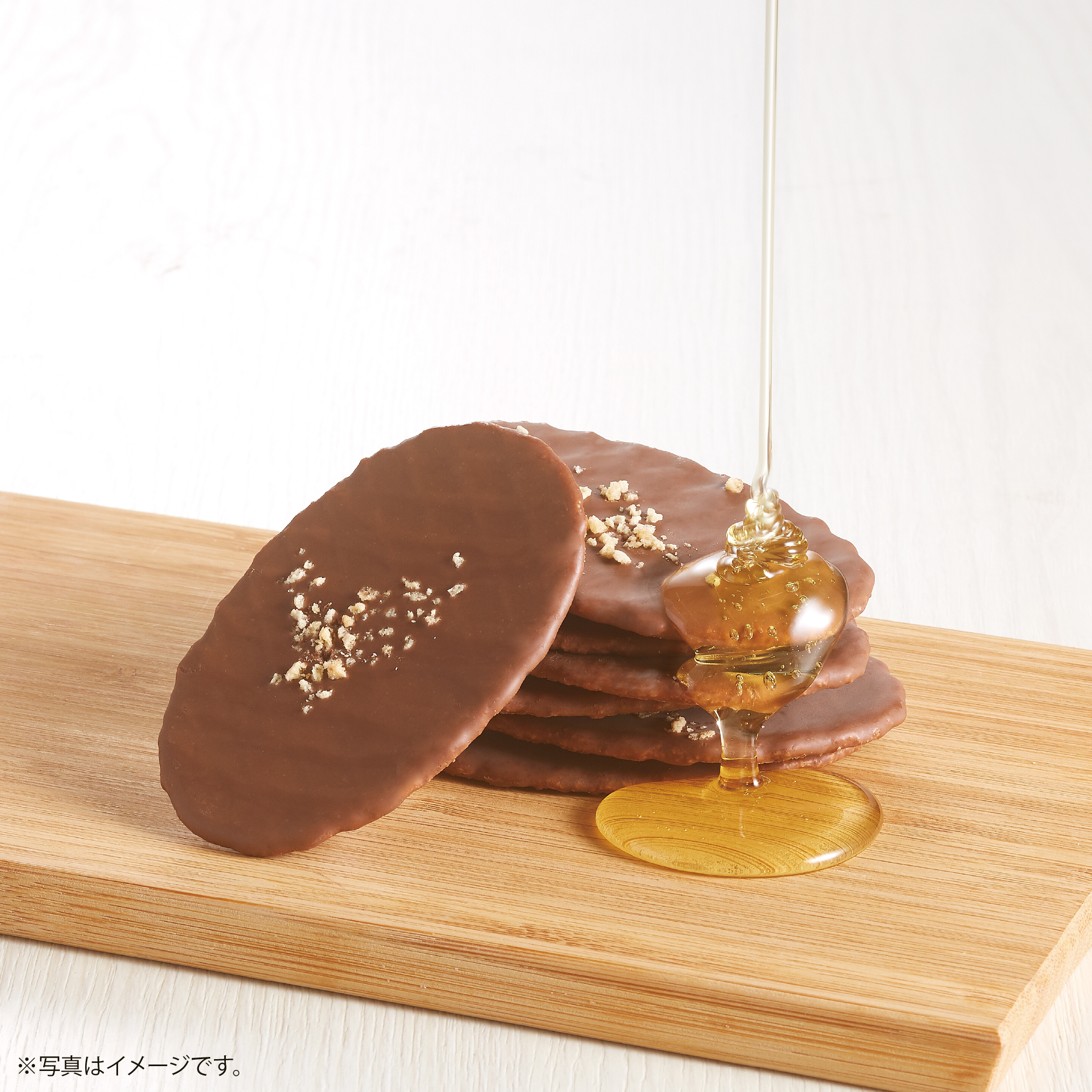 はちみつを使用したワッフルクッキーをチョコでコーティングしキャラメルクランチ(ビスケット)をトッピングしました。