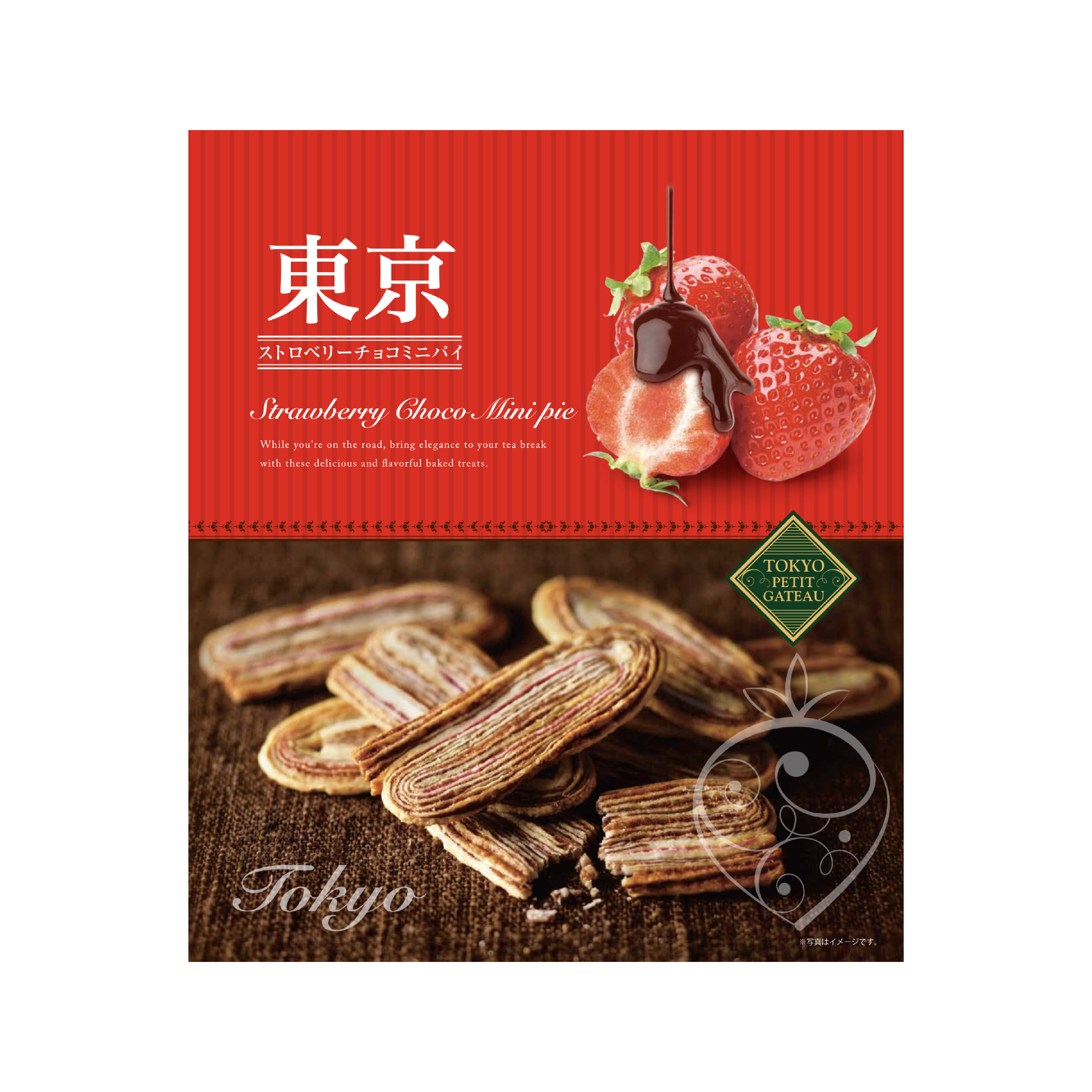 いちごジャムを生地に練りこみ、チョコ風味のクッキー生地を丁寧に折り込んで焼き上げた味わい深いパイです。