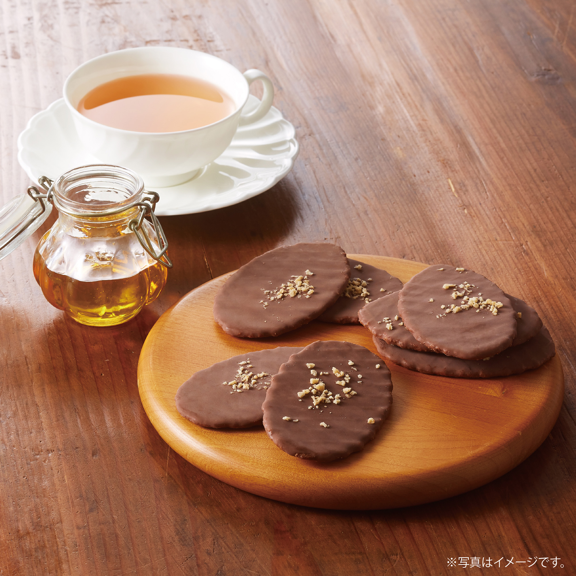 はちみつを使用したワッフルクッキーをチョコでコーティングしキャラメルクランチ(ビスケット)をトッピングしました。