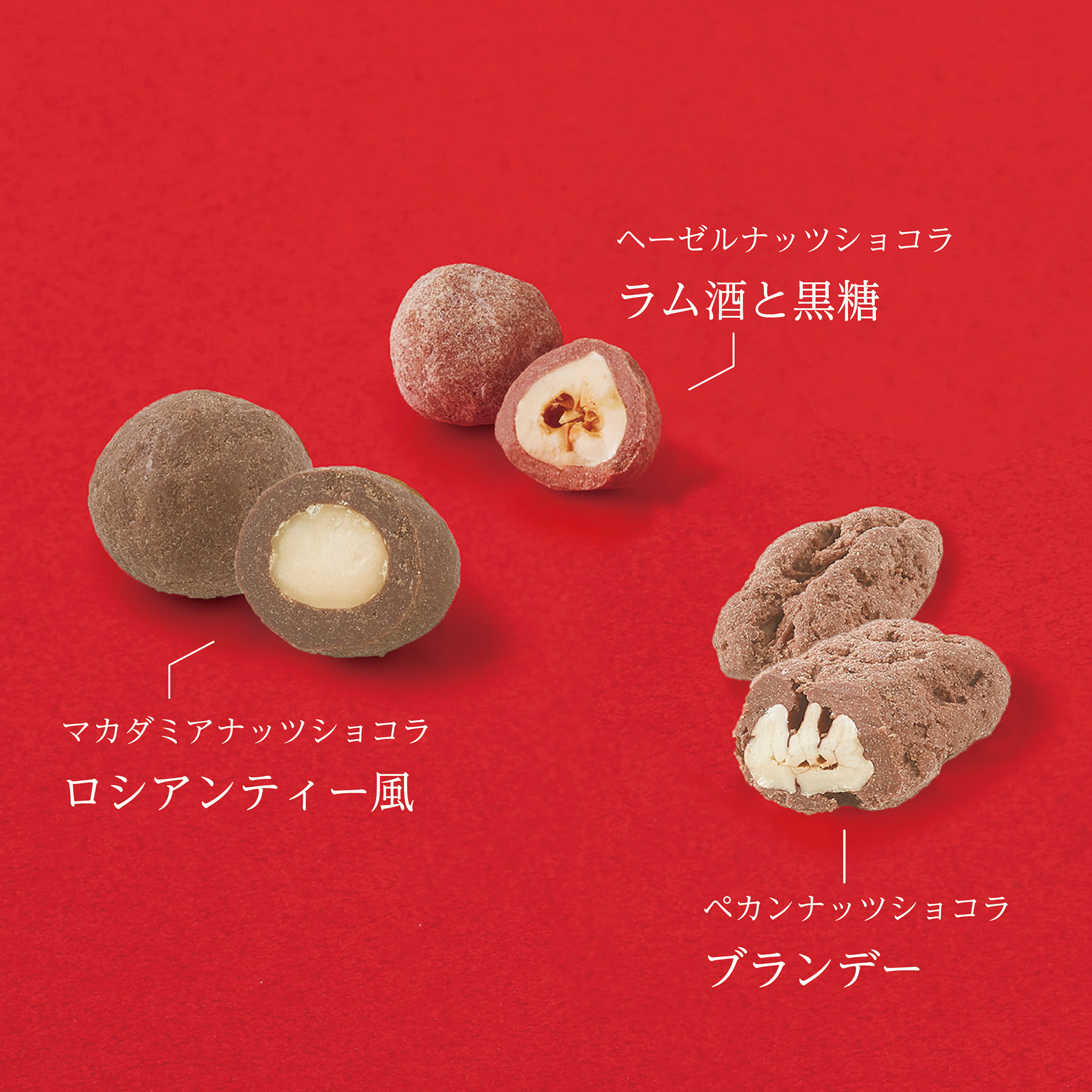 VSOPブランデーの華やかな香り、カカオのほろ苦さ、ミルキーな余韻、そしてナッツの香ばしさと食感が一体になった自分へのご褒美や大人のギフトに最適な、上質と遊び心が共存するひと品。