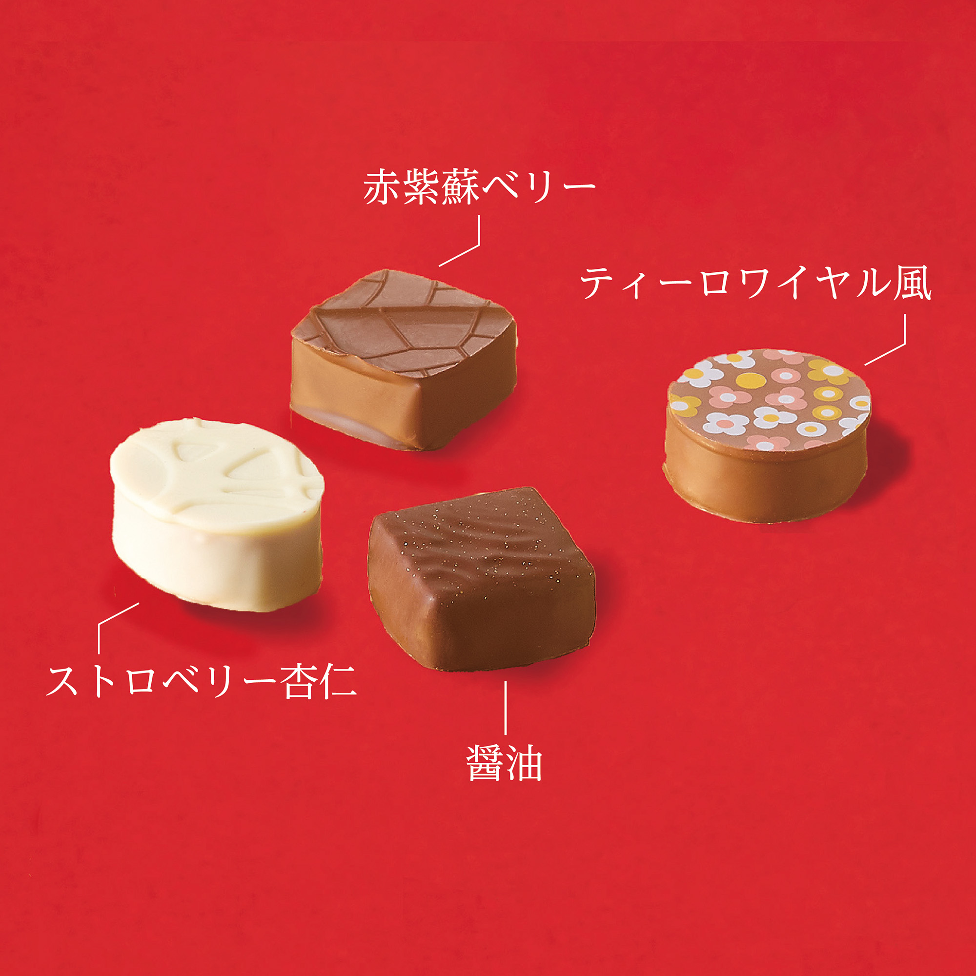 ベルギー産クーベルチュールに「醤油」「赤紫蘇ベリー」「ティーロワイヤル風」「杏仁」4種の厳選素材を組み合わせた、新作3種を含む賛否両論ショコラの決定版。